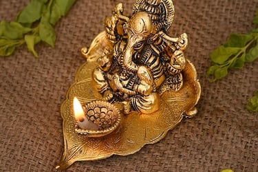 You can use a beautiful Ganesha idol on a decorative leaf base for your altar — it looks divine and perfect for festive décor.
